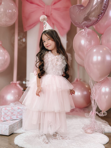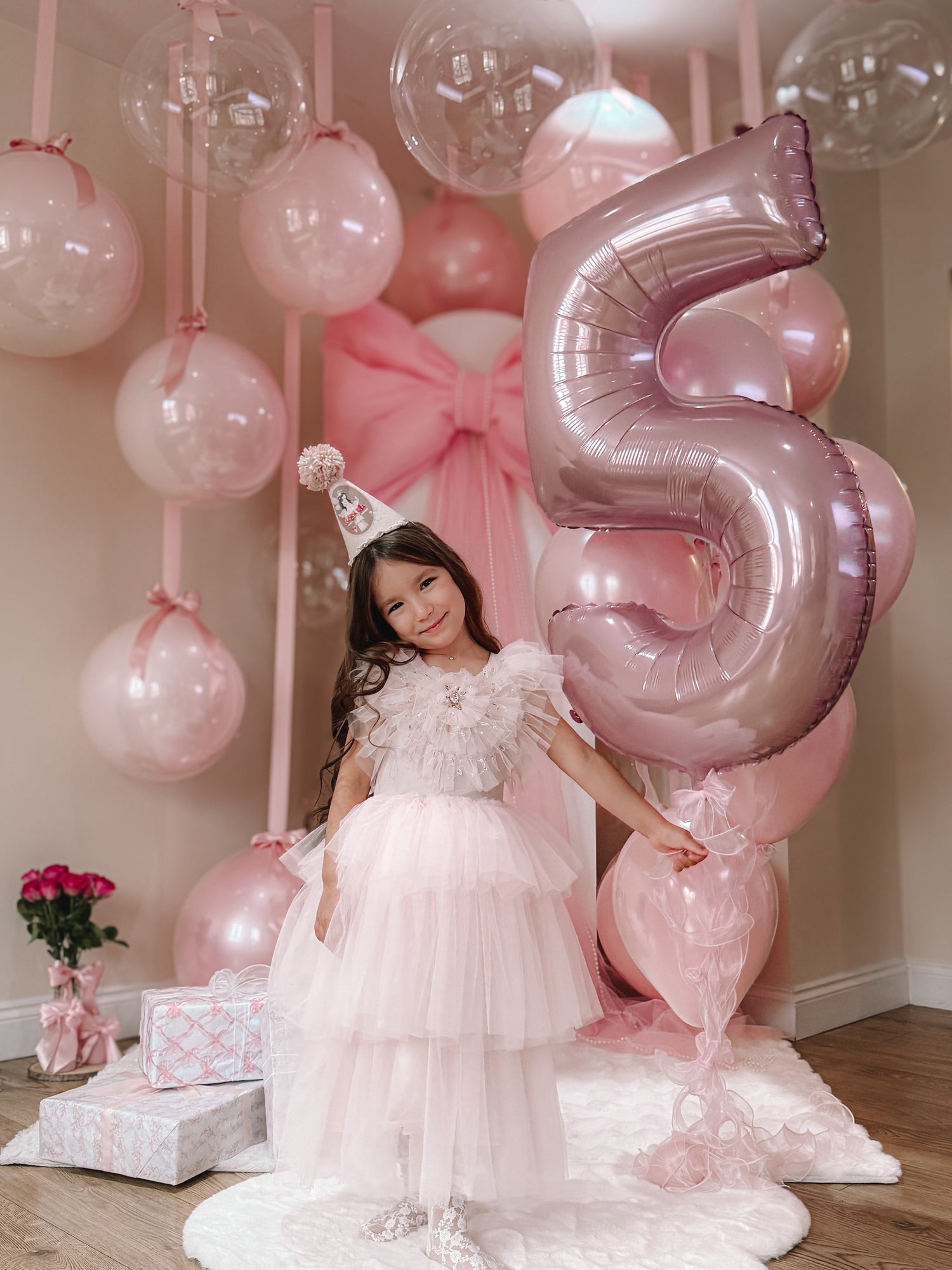 Her sparkling smile and layered gown full of ruffles and shimmer make it the perfect look for a sweet and elegant birthday celebration.