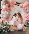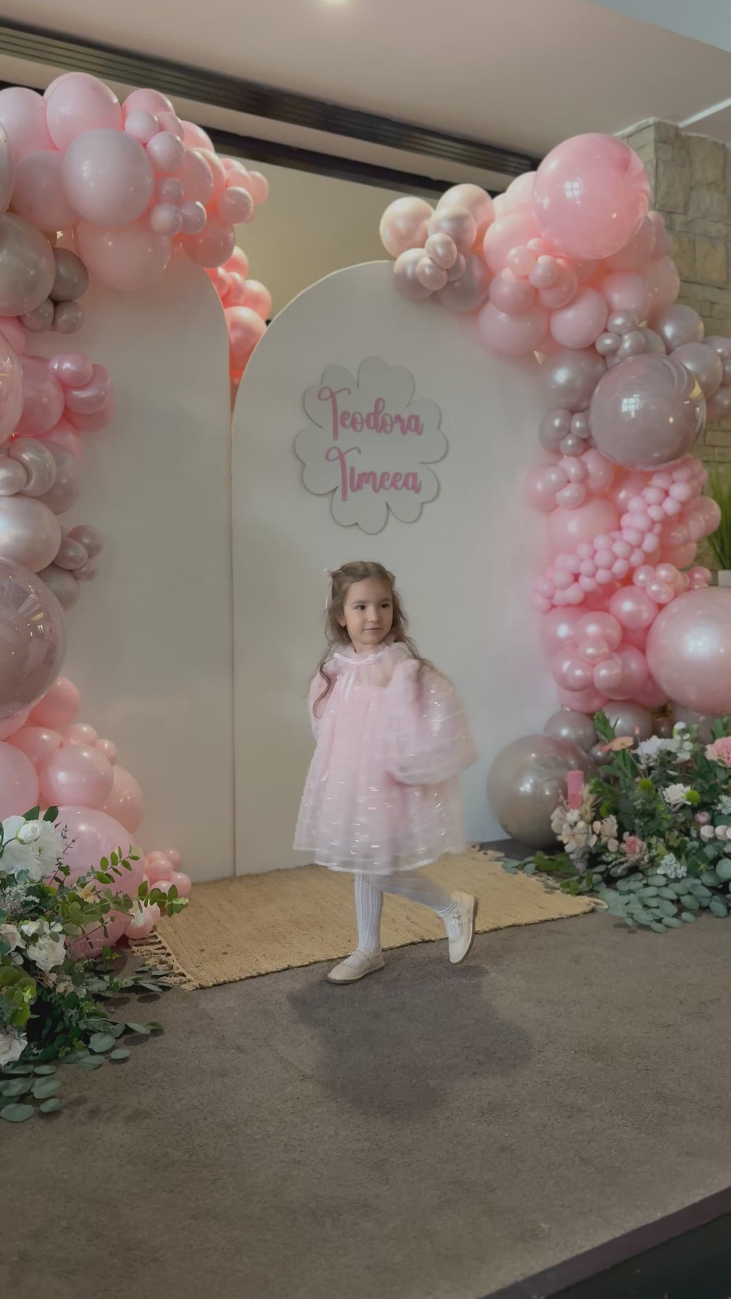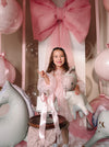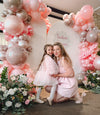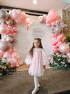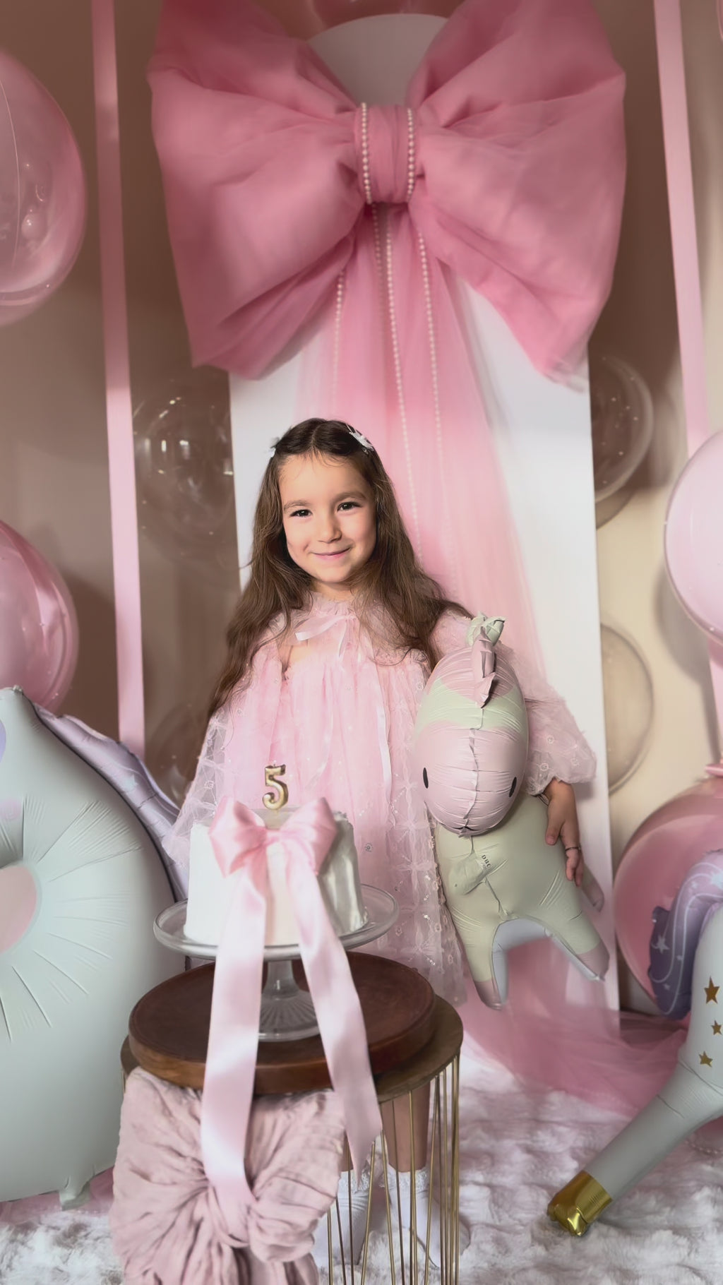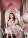 Crafted from lightweight tulle with delicate embroidered patterns, this pink dress features voluminous puff long sleeves and a soft lining for comfort. The bow-tie neckline adds a touch of elegance.